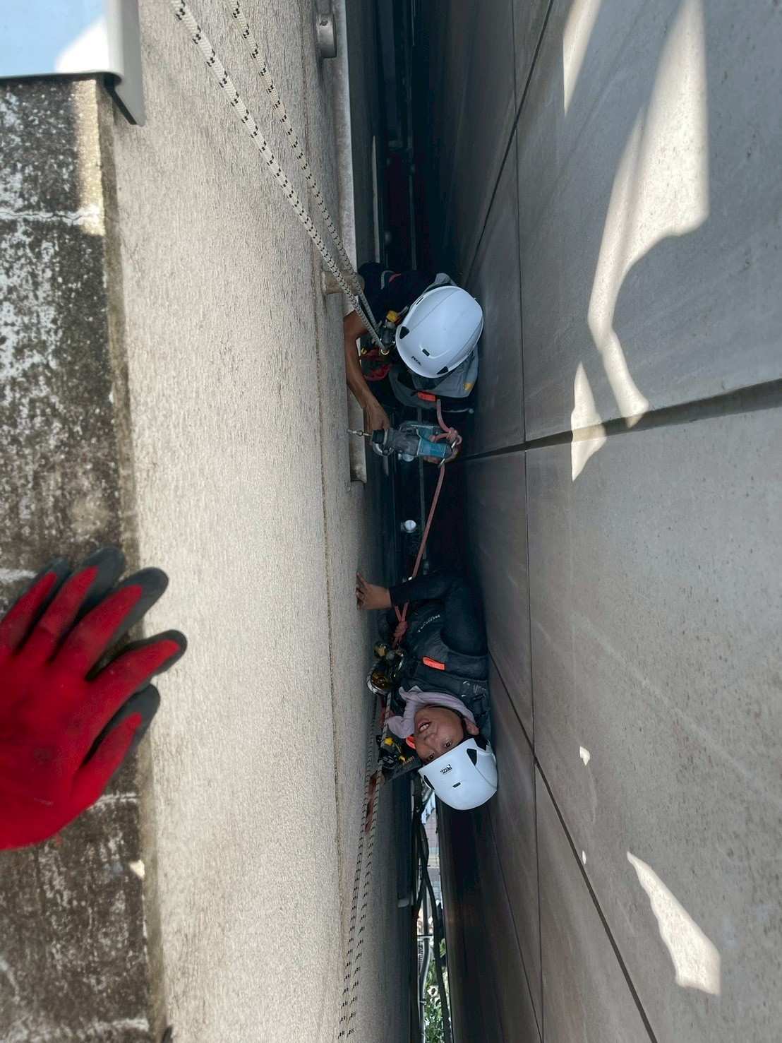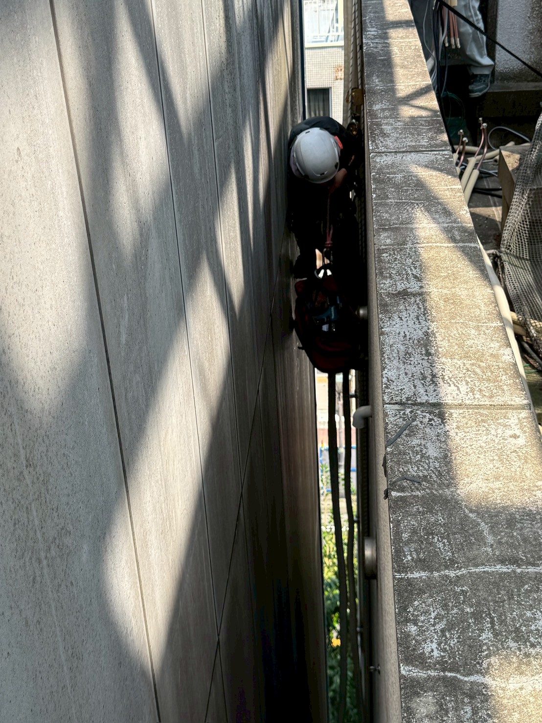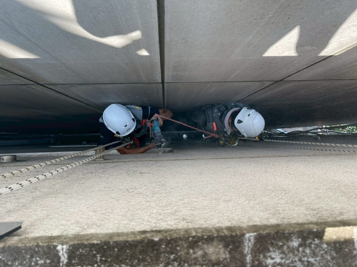 そこで今回は、ロープアクセス工法を用いて施工を行いました。